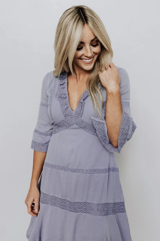 This dreamy boho-inspired dress was designed to make you feel good AND look good.The lace detail throughout the dress adds a romantic, vintage feel while the deep V neck gives the dress a little edge.The fabric is breathable and flowy and super soft.The angled bell sleeves are unique and full of per......