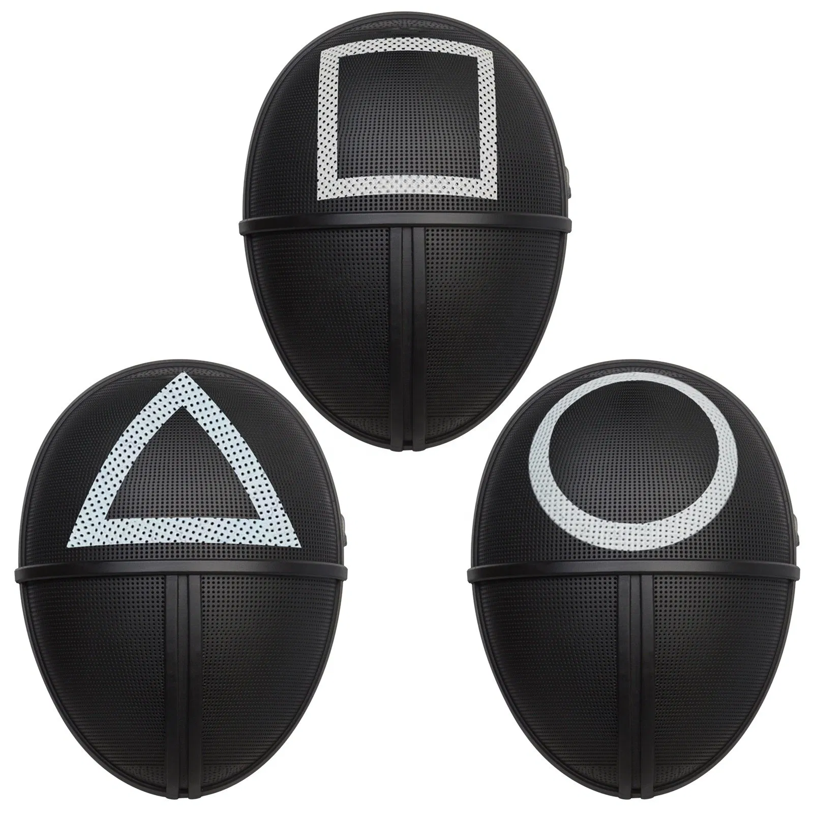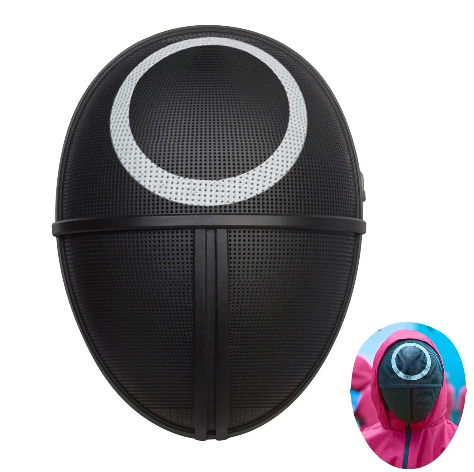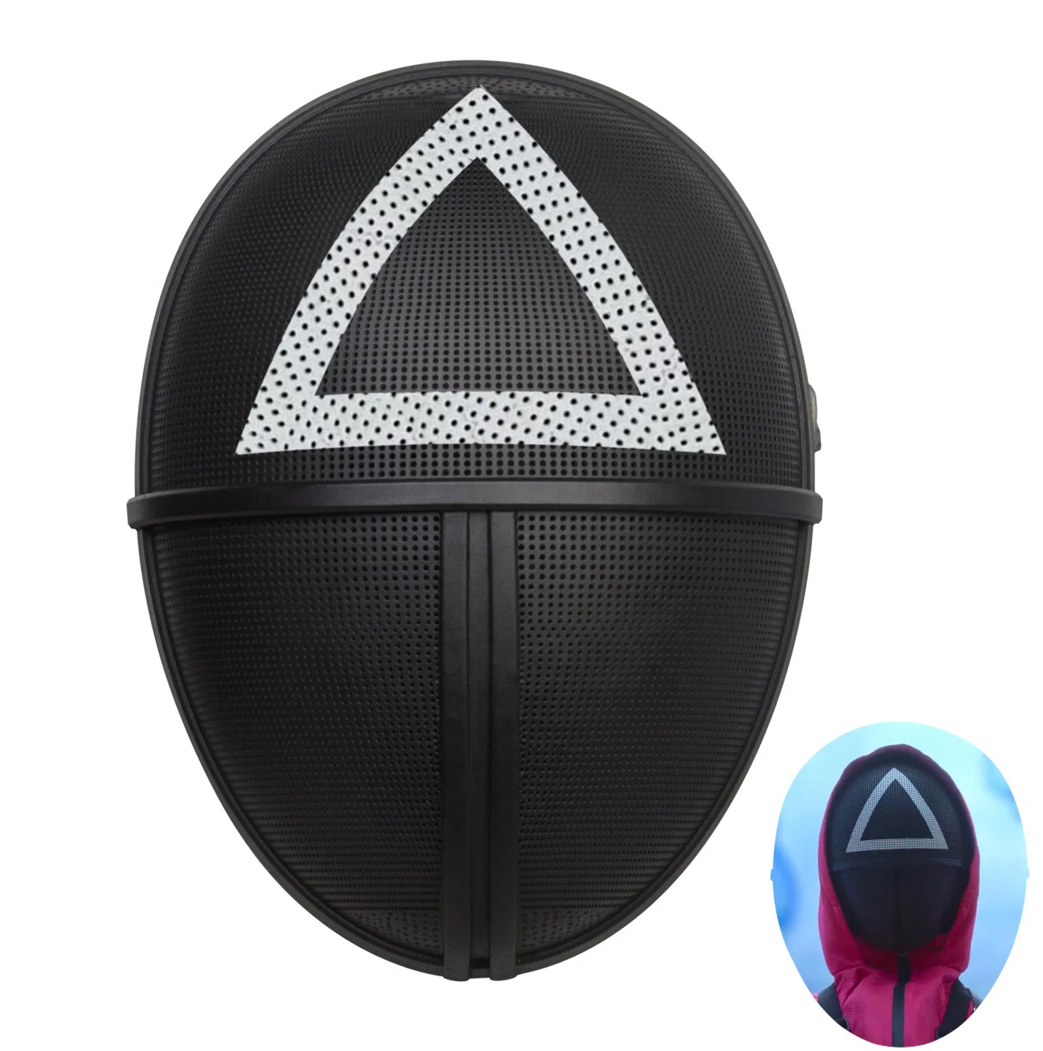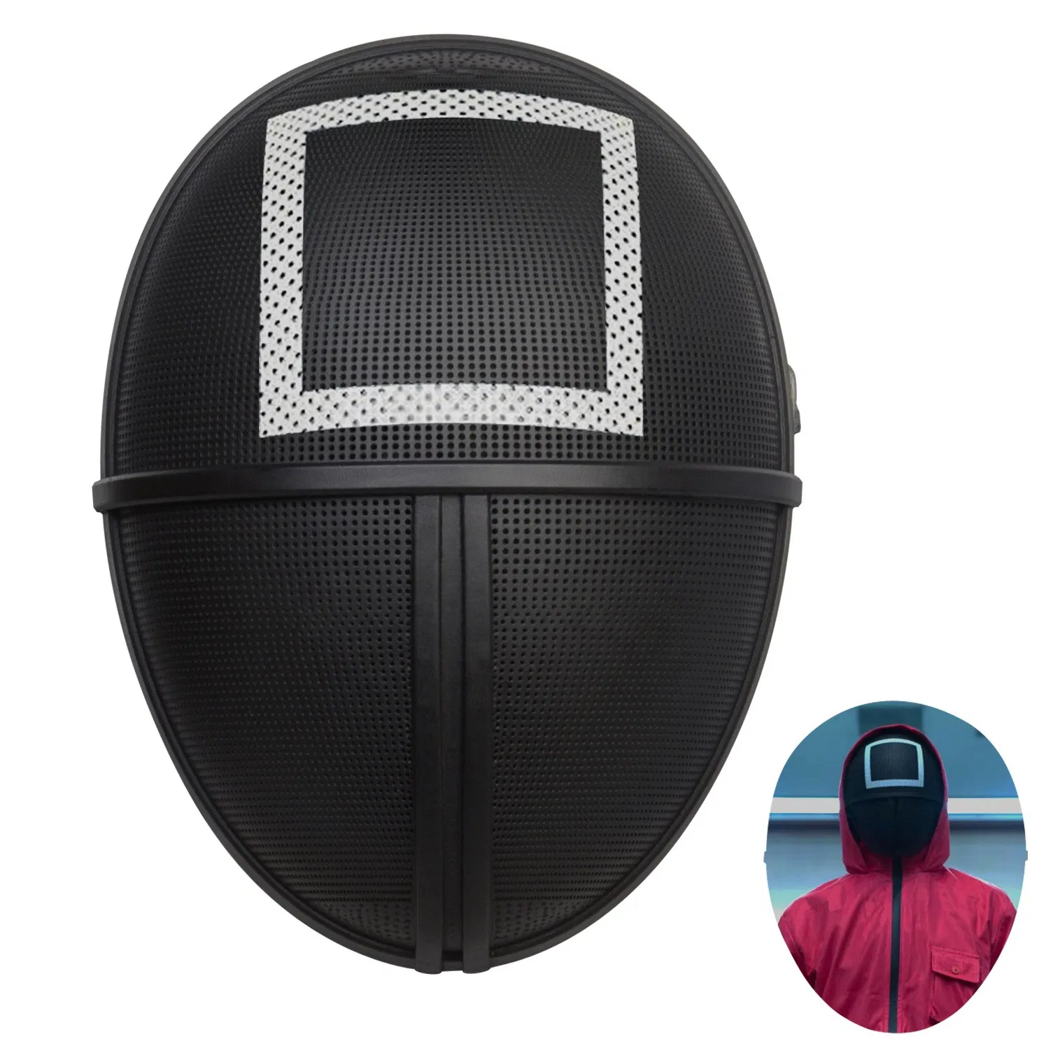 Product Decription: Product description Name: Game Mask Material: plastic + latex Feature This squid gaming mask is made of high-quality durable materials, strong but not bulky. It is well-made, decorated with bright colors, and has a high reducibility to the original character. Choose your favorite......
