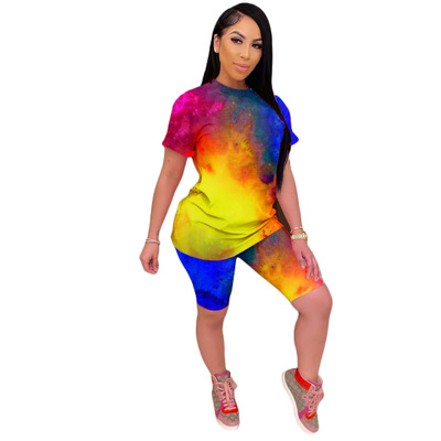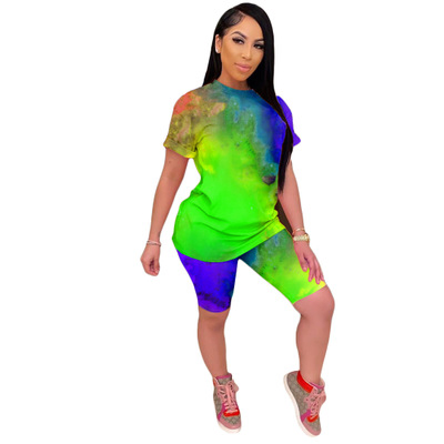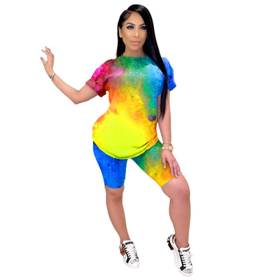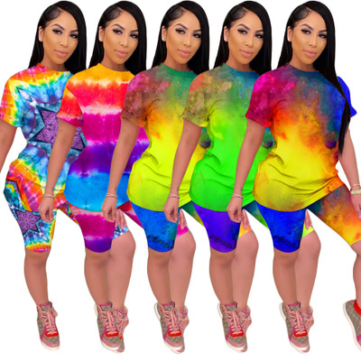 1.2020 Women Sets Summer Tracksuits Fitness Short Sleeve Tie-dye Print Tops+Shorts Suit Two Piece Set Sporty 2 Pcs Outfits