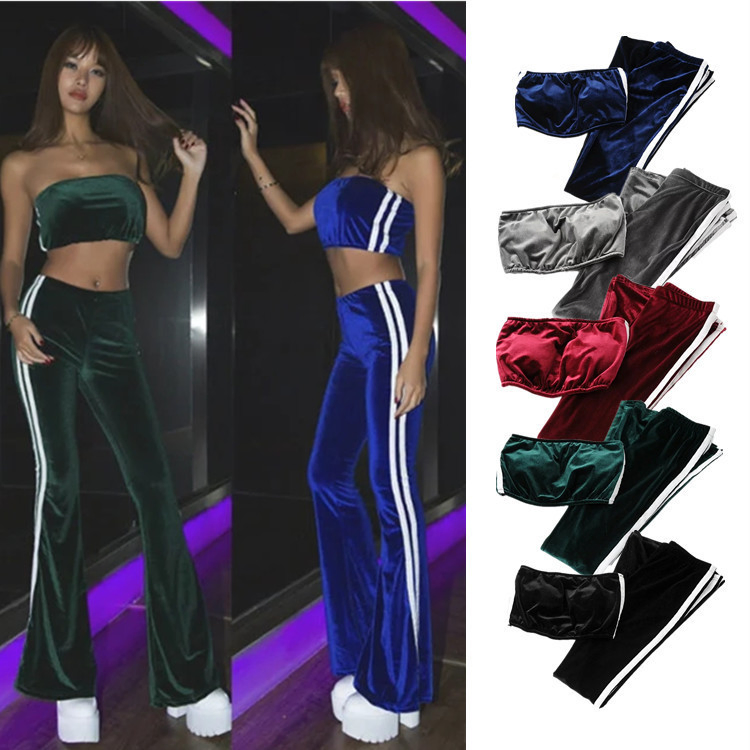 | Item | Fall Velvet Sportswear Women Two-piece Set Crop Bra Top Sleeveless and Long Flare Pants Casual Velour Set |